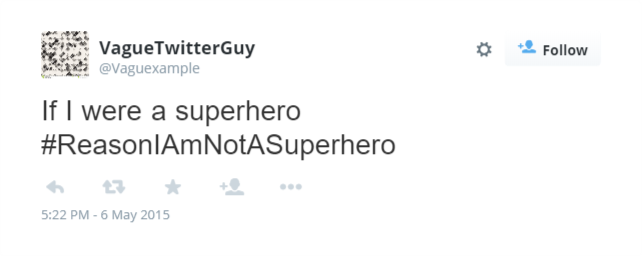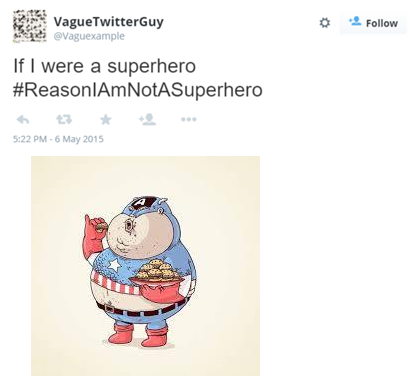 However, as Twitter and other social media are quickly becoming popular sources of natural text, it is important to recognise that ignoring images means ignoring a large portion of potential meaning. In the worst instances, texts become entirely meaningless without the context supplied by the image โ€“ take for example this relatively innocuous tweet about superheroes: