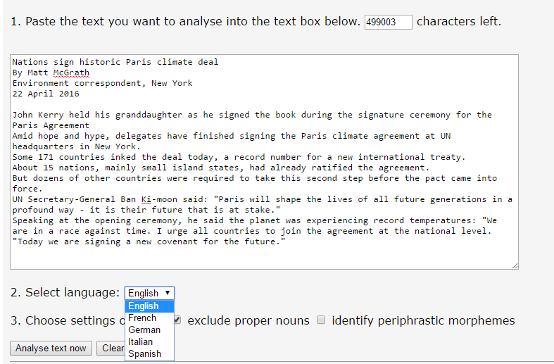 To analyse a text in the Morphological complexity tool, copy/paste the text in the text box, select the appropriate language and press โAnalyse text nowโ (Fig. 1).