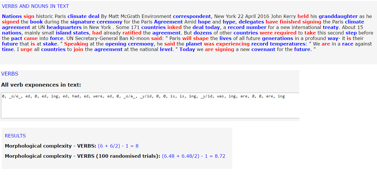 The tool will output the results of the linguistic analysis that highlights all verbs and nouns in the text and identifies morphological changes (exponences). After clicking on the โCalculate MCIโ button the tool also automatically calculates the Morphological Complexity Index (MCI) โ see Fig. 2.