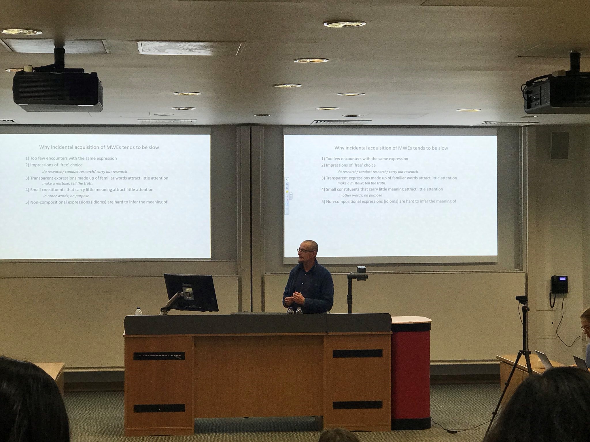 A coffee and a choc-chip cookie later, the third and last session of the day began. Prof. Frank Boers, our invited speaker from Western University, Ontario, Canada, gave a lecture on the applications of the study of collocations to language teaching and learning. Stressing the role played by multi-word expressions such as collocations in L2 acquisition, Prof. Frank Boers drew on his long-standing experience as an applied linguist, teacher and teacher trainer to critically review the ways in which collocations are presented in current pedagogical materials (and presented the do’s and don’ts of textbook exercises).