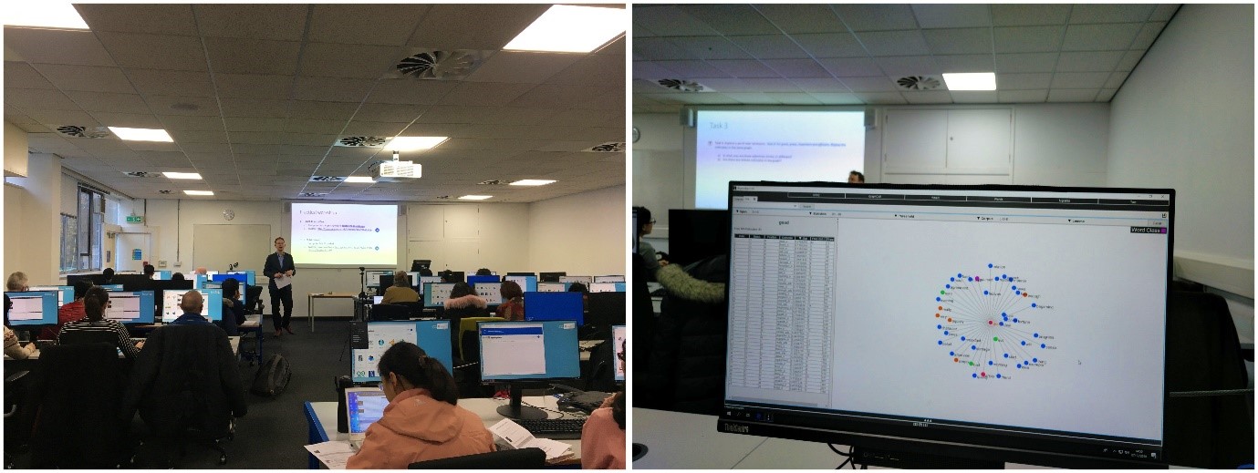 The second session of the day, also led by Dr. Vaclav Brezina, put theory into practice by giving participants an opportunity to search for and analyse collocations in corpus data using #LancsBox. #LancsBox is a free tool developed at Lancaster University and aiming at making the processing of new and existing corpora more user-friendly. Our participants got their hands dirty exploring the different features of the LOB corpus using #LancsBox and learning new data visualisation methods, manipulating several association measures to create firework-like representations of collocation networks.